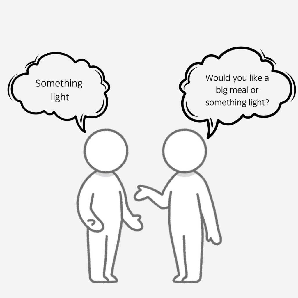 - Use universal gestures such as, putting an invisible cup to your mouth to indicate “Do you want a drink”.